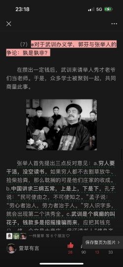 张举人首先提出三点反对意见:a.穷人要干活,没空读书。如果穷人都不去割草放牛、捡柴拾粪,那么耽搁的可是他们庄家的收成。b.中国讲求三纲五常,上是上,下是下。孔子说:“民可使由之,不可使知之。”孟子说:“劳心者治人,劳力者治于人。”穷人识字多,就会出现第二个洪秀全。c.武训是个疯癫的叫花子,钱款多是招摇撞骗而来,应把其钱充公,修一个文昌大帝庙,保证读书人“修身齐家治国平天下”。 年轻的郭芬听闻此言,在众人犹疑时站出来发言,提出两点反驳:a.武训多年来从未把钱用于自身的享乐,而是为了让他人读书。如果说他是骗子,那么社会上像这样大公无私、悲天悯人的骗子还太少。b.读书人应明白民为邦本的道理,他们所有吃穿住行,都是庄稼人供出来的,怎么能这么不体恤他们。眼看着张举人下不来台,他身旁的小跟班插嘴道:“办义学学的是义书,讲的是圣贤的道理,这是办好事。”这里面值得探讨的地方有很多,我简单提出三点:a.张举人所说之言都有其道理,如今许多地方仍有“读书无用论”,在义务教育结束后,为了家庭生计,许多人都放弃了学业,因为他们也有自己的牛要。孔孟之言,我理解的同张举人并没本质上的不同,毕竟这是封建时代的产物,肯定是要维护封建统治。某种程度上来说,这两句也算是“厚黑学”的真理了,古往今来,还没人能跳出其预言。